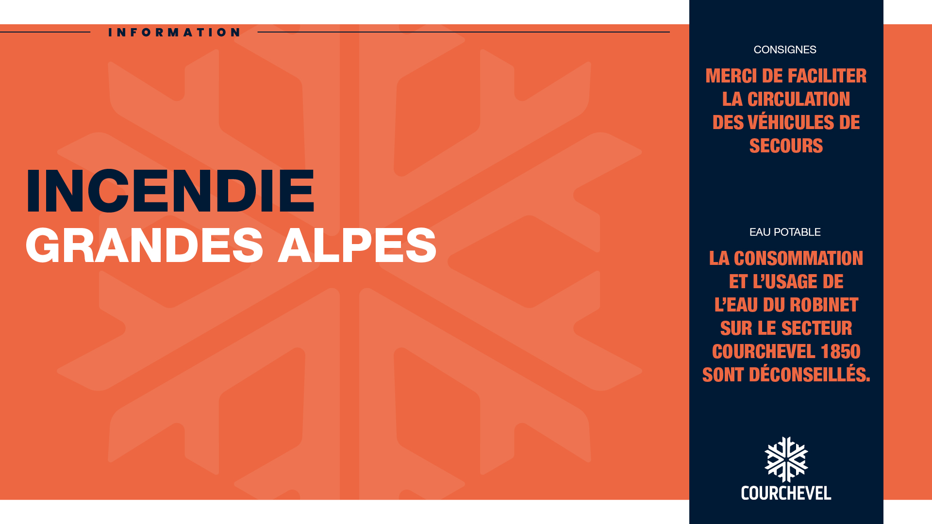 Afin de faciliter les opérations des services de secours, il est recommandé d’éviter le secteur Courchevel 1850 et faciliter le passage des engins de secours.